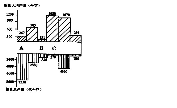 (2)总产量A洲远高于C洲的主要原因是 ;人均产量A洲低于C洲的主要原因是 。
