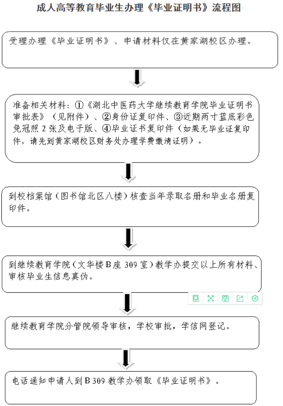 【摘要】根据 湖北中医药大学成人高考 毕业生办理相关事项,小编现将成人高考毕业生办理《毕业证明书》流程图公布如下: 以上就是湖北中医药大学成人高考的毕业生办理《毕业证明书》流程图,申请毕业的同学们记得仔细观看。 编辑...