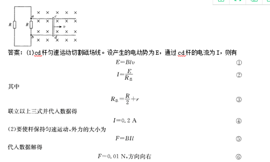 29.如图,间距ι=10 cm的平行光滑金属直导轨水平放置在磁感应强度B=0.5 T的匀强磁场中,磁场方向竖直向下;在平行导轨的左端a、b两点间接入两个相同电阻,阻值R=0.8Ω;电阻为r=0.1Ω的导体滑杆cd放在导轨上且与其垂直。导轨电阻不计。当cd杆以υ=2 m/s向右匀速运动时,求 (1)通过cd杆的电流; (2)使cd杆保持匀速运动,应对它施加外力的大小和方向。