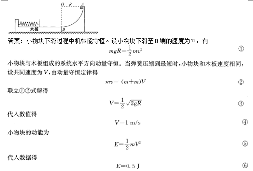 30.如图,AB为光滑固定的{圆弧面,其下端B与一木板的上表面光滑连接,木板可以在光滑水平面上自由移动,其左端固定一个轻弹簧。一小物块自A点由静止沿圆弧面下滑,滑上木板后压缩弹簧。若小物块和木板的质量均为m=1 kg,圆弧半径R=0.2m,重力加速度g取10 m/s2。 求当弹簧被压缩到最短时木板的速度和小物块的动能。