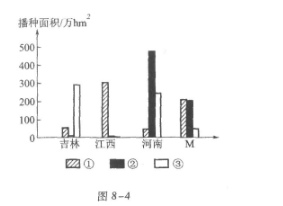 图8-4显示的是我国四个省2004年三种谷物的种植面积。读图回答39~40题: