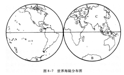 (2)从图8—7中可以看出,跨经度最广的大洲是字母__________ 代表的__________ 洲。完全位于北半球的大洋名称是字母__________ 所代表的__________ 洋。