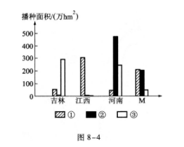 图8—4显示的是我国四个省2004年三种谷物的种植面积,读图回答39~40题: