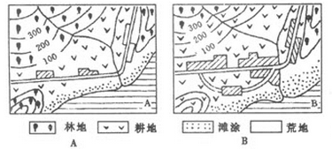 (2)A、B两图相比,土地利用方面发生的主要变化是:①__________; ②__________ ;③__________