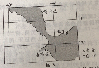 2015年3月26日,也门安全局势突然化,600多名中国公民受国也门,3月26日深夜,在附近海域执行任务的中国海军护航编队接到任务,从也门荷台达港和亚丁港撤侨到古布提港(位置见图3)。4月2日,编队完成撒价任务,并协助巴基斯坦等国公民撒离。据此完成24~26题