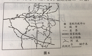 图6示意我国某省铁路的分布。该省在古代就是全国重要导道和滑运必经之地。知今铁路四通八达,地方铁路里程居全国各省(市、区)之首。据此完成33~35题
