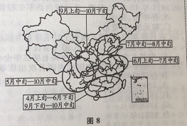 我国东部和中部地区的降水受手风彩响很大。随着季风的进退,降水有明显的李节变化图8示意我国雨带位置的变化。据此完成39~40题